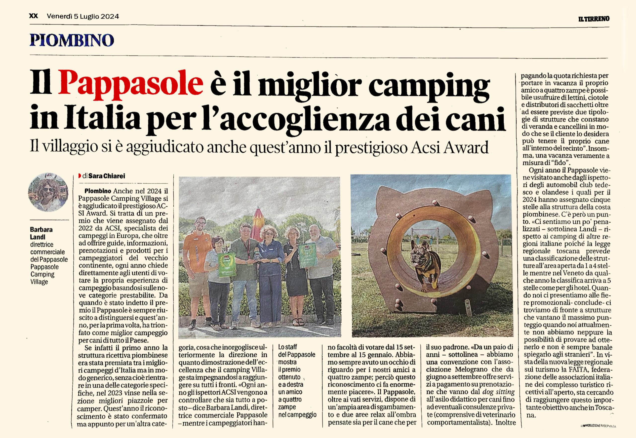 PIOMBINO. Anche nel 2024 il Pappasole Camping Village si è aggiudicato il prestigioso ACSI Award. Si tratta di un premio che viene assegnato dal 2022 da ACSI, specialista dei campeggi in Europa, che oltre ad offrire guide, informazioni, prenotazioni e prodotti per i campeggiatori del vecchio continente, ogni anno chiede direttamente agli utenti di votare la propria esperienza di campeggio basandosi sulle nove categorie prestabilite. Da quando è stato indetto il premio il Pappasole è sempre riuscito a distinguersi e quest’anno, per la prima volta, ha trionfato come miglior campeggio per cani di tutto il Paese.